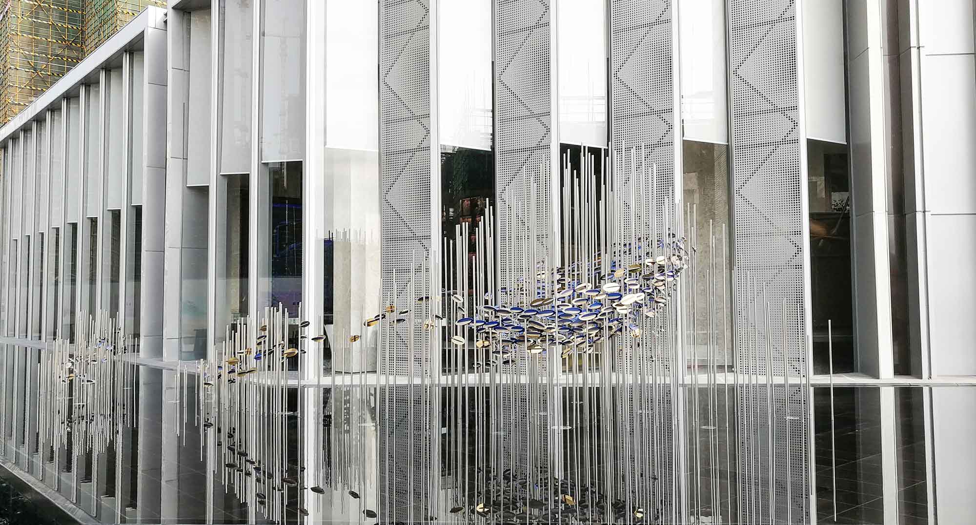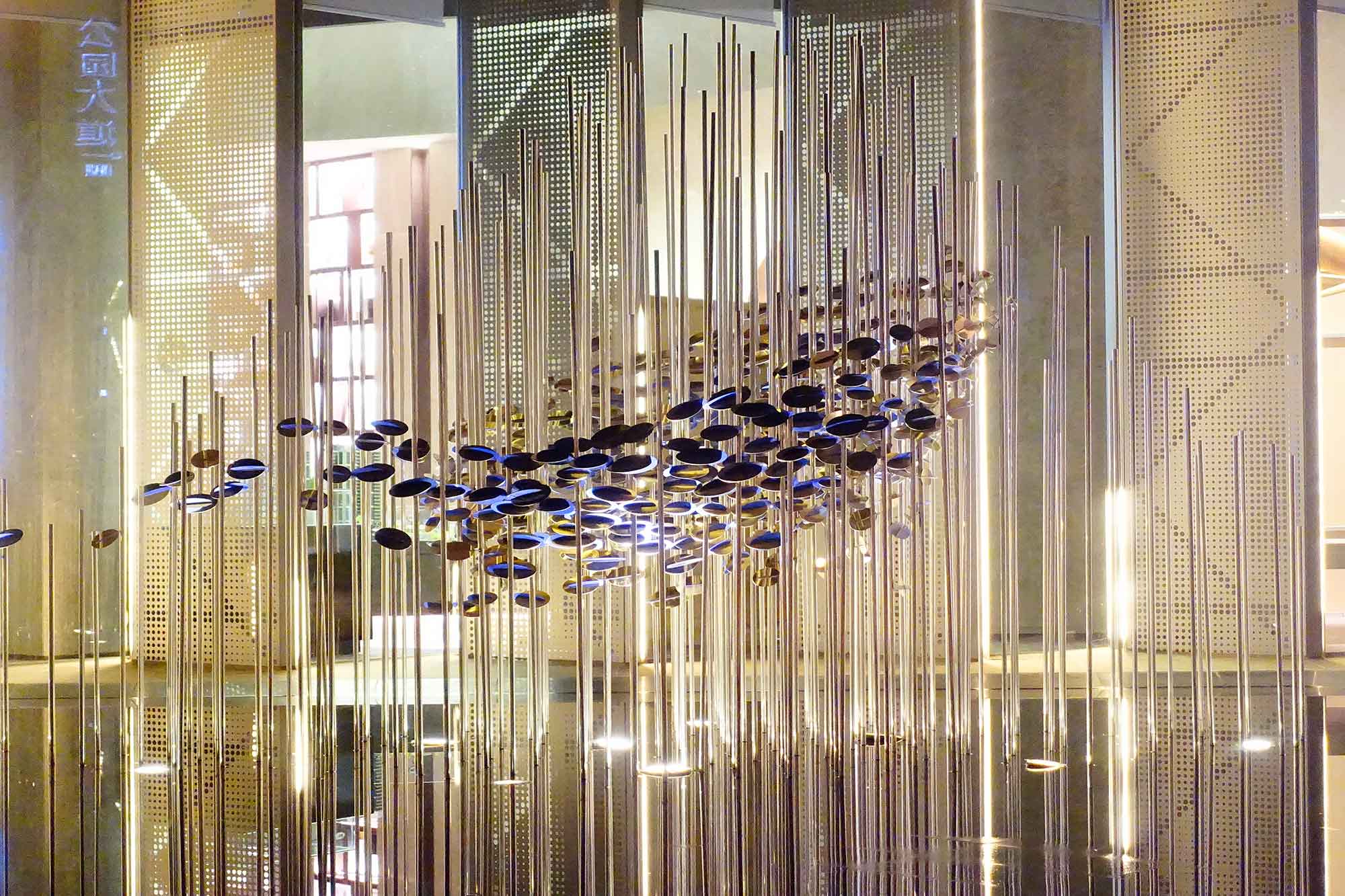 项目:广州公园大道 业主:保利地产 设计:GOGAR 承建:GOGAR 地点:广东省广州市 年份:2018 材质:不锈钢、LED灯、喷雾装置 尺寸:最大高度2800mm 水景装置“百鸟归巢”运用抽象几何的方式呈现了一幅“百鸟归巢”的景象,以“百鸟归巢”的自然景象展开创作,塑造一种宾至如归的体验感。